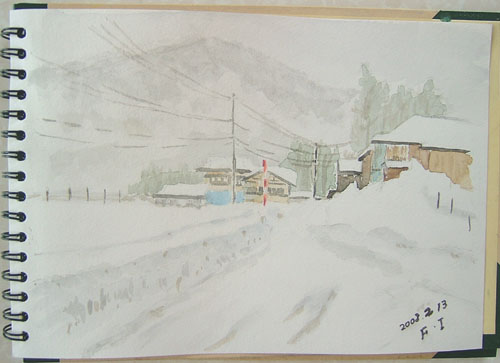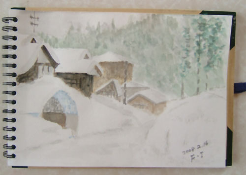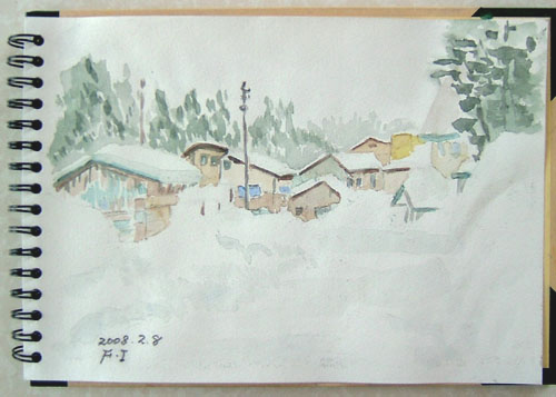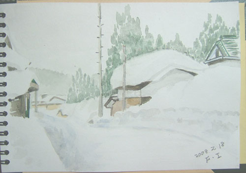 NO.506 2月最初のスケッチ(^-^;)(08/2/8)今月に入ってなかなかスケッチするチャンスもなく、久々に午前中曇ったり晴れたりする中をスケッチして来ました(^-^;)昨夜のチョット寝不足と寝相の悪さで、今朝は少々頭がボ〜っとしていたのですが、出来上がりの絵もボ〜っとしてませんか?(^ー゚)ノ ここは、由利本荘市鳥海町・猿倉集落の雪景色です。 ここは地元温泉行き帰りに通る道路です。雪深い集落風景を狙おうということでしたが、家がゴチャゴチャあって 難しかったです〜(^-^;) ![]() 描いてる途中、お天気が変わるので、困りますね〜。色を付けるときは曇り、頭と同様、ボ〜っとしてます(^-^;) 何とかスケッチらしい絵になったかしら?(^-^;) やはり、同じ場所で描いた主人の絵もあります(^。^) こちらのページから ご覧になれますが、本当に比べないでね(~o~) 午後からは、ボタン雪が降ったり、太陽が出たり、変な一日です。 明日の土曜日は、関東地区に雪が又降るような予報が出てますが、 またまた、事故や転んで怪我人が出ないよう祈ってますよ〜(^-^;) |