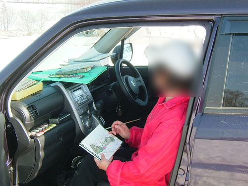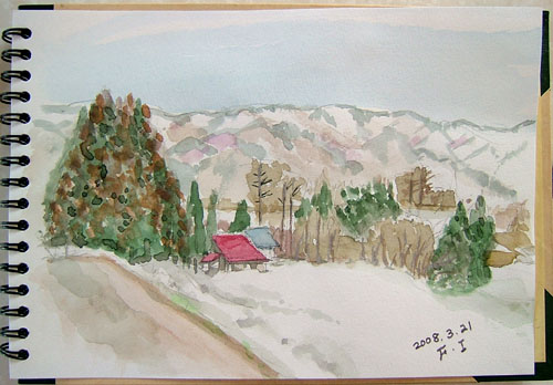 NO.521 2枚もスケッチ(^-^;) (08/3/21)早朝から主人は、土井さんが乗ってる宇宙ステーションISSが飛行する写真撮影に4時半前から起きて準備。 一緒に飛行を見上げながら 「あ、土井さん、手を振ってる〜♪」と冗談言いながら、一緒に見てました。(^-^;)♪ここから次回は26日、お天気良ければ、又、見られるそうです. 朝から快晴、鳥海山も姿を現わし、家に居るには勿体無い気分でいると、やはり、久々にスケッチに誘われ、午前中1枚描いて来ました(^-^;) ここは由利本荘市鳥海町・小川集落の風景です。 茅葺屋根の大きな住宅は、スーパー・スター俳優・三船敏郎さんの お父様の実家です♪ でも、だいぶ雪が融けてしまって、描くの難しかったです(^-^;)♪ ![]() ![]() 昼食後、もっと雪のある風景を描きたいという事になり、何と、又、スケッチしに行って来ました(^-^;) ここは、由利本荘市鳥海町・上原集落の風景です。 バックの山並みが美しいので、描いてて楽しかったですが、どうかな?(^-^;) ![]() ![]() 同じ場所で描いた主人の絵も こちらのページから ご覧になれますが、今日の絵は、比べないでね〜(*^-゜)⌒☆ |