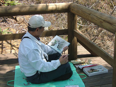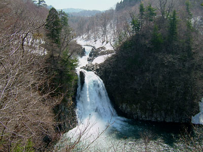 NO.533 法体の滝、初スケッチ♪ (08/4/21)朝から、鳥海山がくっきり顔出し、お天気上々〜〜♪今日も又誘われて、法体の滝までドライブ&スケッチに行って来ました(^-^;) 行く途中、直根の友達の家にちょこっと立ち寄ったのですが、 手作り金魚の飾り物を2個ペアーで頂いちゃいました〜(^-^;) 法体の滝へ行く途中、雪の中で芽吹いているブナと、辺りに雪があるのにピンクの濃い山桜が咲いていました。 記念に撮りましたので、ご覧下さいませ〜♪ (直根(ひたね)から百宅(ももやけ)に行く途中です) ![]() ![]() 滝に到着し、吊橋を渡り、展望台まで歩き、さぁ〜、ここが今日のスケッチ現場です(^-^;) ![]() ![]() ここは、我が鳥海町にある『法体の滝』です。日本名滝100選にも選ばれています。 今の時期は、雪解け水の為に水量が多く、弘法大師様のお姿が見えませんでした(^-^;) ![]() 短時間のスケッチ終了する頃、東京の両国(相撲)の近くから来られたという アマチュア・カメラマン?のおじ様とお喋り(^-^;)。 好きな人は、わざわざ、こんな遠くまで撮影に来られるんですよね〜(*^-゜)v ![]() ![]() |