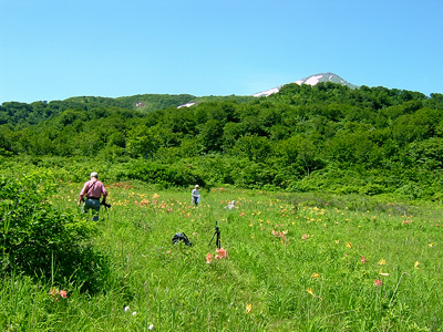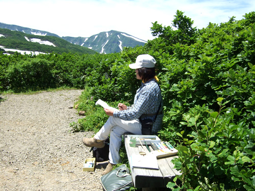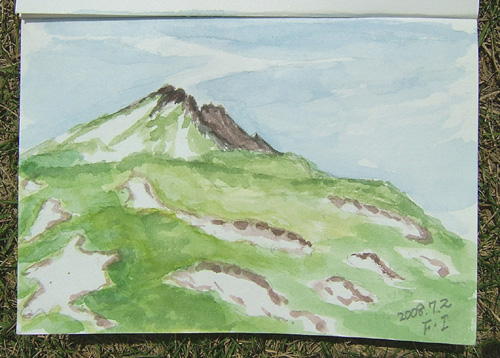 NO.563 今月初スケッチ、鳥海山行って来ました♪ (08/7/2) 今年後半始まりの7月は、物価値上がりラッシュで始まりましたね〜\(`o'゛;)。 何でも値上げで・・・、でも、負けてなんていられません! 早朝から、雲ひとつない快晴の空に誘われて、鳥海山の4合目お花畑や、5合目までスケッチドライブして来ました♪ ここは、4合目の自然お花畑ですが、もう、ニッコウキスゲは盛りを過ぎ、レンゲツツジも盛りを過ぎ、ウラジロヨウラクが真っ盛りかな〜♪ 楽しみにしてたサワラン、トキソウの姿は無く、誰かに荒らされたのかしら? 到着したら、既にアマチュアカメラマン3人組が来てましたよ〜。 見て、見て〜、ウラジロヨウラクの写真ですが、アングル変えると花の形も違いますね〜(^-^;) ![]() ![]() ニッコウキスゲとレンゲツツジ、キャ〜〜、派手な色〜〜♪ ![]() ![]() 左下の画像は、鳥海山5合目の少し下の写真スポットと、右下は5合目登山入り口の祓川(はらいがわ)♪ ![]() ![]() 5合目湿地帯に咲く、ヒオウギアヤメとノウゴウイチゴです♪ (他にも、イワイチョウ、ツマトリソウ、イワカガミ等もありました♪) ![]() ![]() 展望台に向かって歩き、手前の左側で鳥海山と稲倉岳が見える場所でスケッチ開始しようとしたら、 何といつものスケッチブック忘れて、 別の小さいのが入ってました(^-^;) 日差しが強いので、日焼けが気になり、速攻で描きましたよ〜〜(^-^;) 今回は、残雪だけをメインにして、記念に描きました♪ だいたい、あってますよ〜(^-^;) 久々にスケッチしてる様子もオマケで見てね〜 同じ場所ですから、比べないでね〜 o(〃^▽^〃)o おまけ画像。 スケッチ終了後片付けて、記念に撮った現場写真です(^-^;) ![]() ![]() 以上、鳥海山、本日の地元情報でした〜♪ |