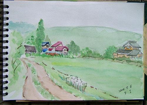 NO.565 近場でスケッチ♪ (08/7/5)![]() 朝からガスがかかり、スケッチ日和です〜♪ 近場で場所選びしたのですが、主人が子供の頃カジカを取ったという子吉川支流に下りて行ったみました。 ところが、スケッチ対象にならず、 なんと、こんな蛇に会っちゃいました〜〜(^-^;) 穴から出て来たらしく、写真撮ってると、尻尾の方から出てきた穴に戻って行きましたよ〜(^-^;) ![]() ![]() ![]() ここは、由利本荘市鳥海町・芦ヶ渕集落の風景。 主人が少年の頃は、芦ヶ渕から八木山集落に至る道路は町道だったそうです 今は農道となっており、関係者しか通らない道ですね。 とても、懐かしい場所とのことで、スケッチでした。 今の市道(車道)は、絵の中の家が見える傍に有ります。 同じ場所ですけど、狙いは違いますよ〜 o(〃^▽^〃)o |