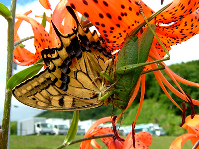 NO.590 『釣りキチ三平』撮影現場に行って来ました〜♪ (08/8/26)すでに、撮影が行われていましたので、ちょこっとだけご紹介しますね〜(^-^;) 今日の滝は、綺麗でしたよ、お天気も晴れ間がのぞき、絶好の撮影日和でしょうね〜♪ 俳優さん、影武者さん、エキストラの方々もいらして 快調な撮影だと思います。 ![]() ![]() 石の階段195段登ると、展望台があり、そこから撮影した本日の全景と、 もう少し登って、途中から眺めた撮影現場。 ![]() ![]() ![]() ここで、暫くスタッフの方達とお話してて、 昼食時には俳優さんに会えると聞きましたが、 撮影禁止とのこと(^-^;) 詳しくはこちらのニュースでもご覧になれます。 食事処「すえひろ」の前で咲いてたオニユリに、アゲハとキアゲハが飛び回ってたのですが、 あら? このキアゲハ、何してるのかと思ったら、 ウマオイに捕まり食べられてました〜ε=( ̄。 ̄;A ![]() ![]() 帰宅途中に撮った、萩の花と宵待草(アカバナ科マツヨイグサ属)この花を見ると竹下夢二を想い出しますね♪ 「待てど暮らせど来ぬひとの宵待ち草のやるせなさ・・・ 今宵は月も出ぬそうな。」と詩っています。 子供の頃は月見草と呼んでいましたが実際の月見草は白い花とのこと。 ![]() ![]() |