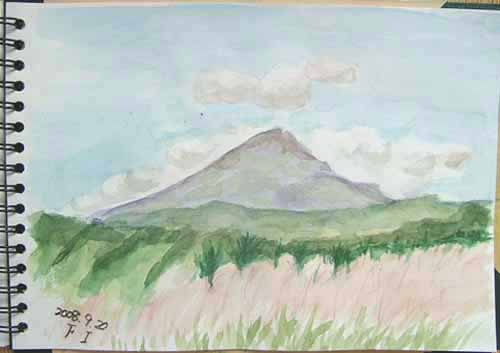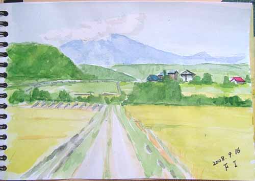 NO.598 またスケッチに誘われて〜(^-^;) (08/9/16)今日の現場は、由利本荘市鳥海町・八木山集落よりの鳥海山。 手前の田んぼの農道左側は、主人の少年の頃は、我が家の田んぼだったそうです。 この農道の奥は川が流れています。 絵の中央を横に走る線は国道108号線です。 この辺りは今月20日過ぎると、そろそろ稲刈りが始まりますので、 その前に黄金の田園風景を描いたいとのことでした。 今日は、お花も撮ってないし、久々にスケッチ風景を〜\(☆^∇゚)o 今回も、車中なのでマタマタ狙いは同じですが、 比べないでね〜 o(〃^▽^〃)o ![]() そうそう、スケッチ終了後、 帰宅途中で見た、雲の形ですが、 東京ののアサヒビールの オブジェに 似てませんか〜\(☆^∇゚)o |