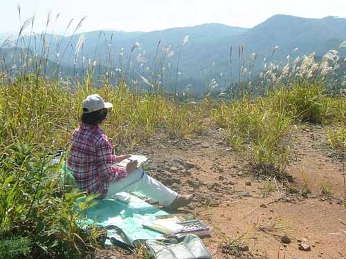 NO.599 またもスケッチに誘われて〜(^-^;) (08/9/20)今日のスケッチ現場は、由利本荘市鳥海町・オコジョランドスキー場からの鳥海山です。 ススキの沢山生えるスキー場の上から鳥海山を描こうということになりました。 このスケッチ現場のすぐ近くに我が町の温泉ホテル『フォレスタ鳥海』があり、そこから歩いても5分くらいですね。 今日は、夏日のような日差しの中のスケッチ、日焼け防止の長袖姿を公開しますね〜ヾ(>▽<)o 暑かったので短時間スケッチでした〜\(☆^∇゚)o 座るシートが1枚しか持って行かなかったので、マタマタ狙いは同じですが差が付き過ぎ〜ヾ(≧▽≦)ノ そうそう、スケッチ終了後帰宅して、庭に咲く菊の花を撮ったのですが、 これは何年か前、たった一本の挿し木で育った花なんですよ。 名前は分かりませんが(^-^;) それから、昨日、玄関の風除室に入って来た、アオモンイトトンボのペアー\(☆^∇゚)o でも、緑色が綺麗でしたが、写真は逆光で失敗ですね〜(^-^;) ![]() ![]() |