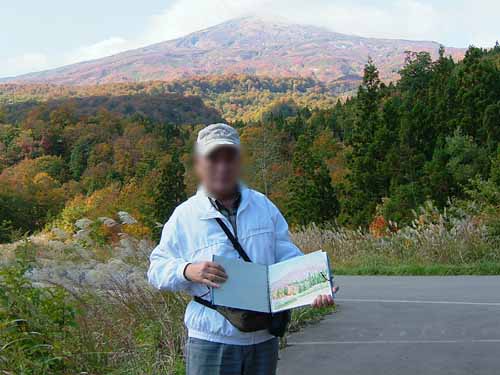 NO.569 地元の紅葉スケッチ&キノコ採り♪ (08/10/12)今日は、健脚美人を目指して山歩きに出かけたついでに、 スケッチを用意して鳥海山観光道路をドライブ♪ ここは、堰口(せきぐち)展望台の駐車場から見た今日の鳥海山。 もう、真っ赤っか〜ですね〜♪ 今日の現場は、由利本荘市鳥海町・堰口方面からの鳥海山。 堰口から法体の滝へ至る道路の、脇の道路に車を停めて、紅葉が始まった道路付近と鳥海山です。 頂上付近は雲に覆われてましたが、既に晩秋の色へと変わっていましたよ。今日も短時間スケッチ(^-^;) 今回の絵も車中からで狙いは同じ、きんぎょの絵、紅葉に見えるかしら?(^-^;) 今日は、主人のスケッチ出来上がりを記念撮影(^-^;)。 スケッチ終えて、「法体の滝」に行く途中の景色♪ 法体の滝に着いたら、由利本荘市から来られたと話された、 絵画教室のグループ7人とかでスケッチや油絵などをされてましたよ〜♪ 滝の上流(玉田渓谷)を40分くらい山歩きでした。 健脚美人にならなくっちゃね〜\(☆^∇゚)o そこで、見つけた、キノコ。 大きくて、たくさんのツキヨダケ(毒キノコ) (≧m≦)ぷっ!