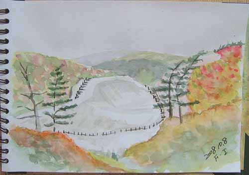 NO.566 須川湖紅葉のスケッチ&温泉♪ (08/10/4)スケッチ現場の須川湖では、もう紅葉が始まっていました。 急いで、スケッチ用具を広げてのスケッチ。 スケッチ2枚描き終えたら丁度タイミングよく雨がポツリポツリと (^-^;) 一枚目は、須川湖遊歩道から眺めた山側方面。 二枚目は、須川湖のボート乗り場付近をスケッチ。忙しかった〜(^-^;) 今回の絵も狙いは同じ、 比べてもイイですよ〜\(☆^∇゚)o (^^;☆\(▼▼#) ここまで来たら、温泉は入らなくっちゃ〜ネ\(☆^∇゚)o ![]() 温泉には、岩手県一関市から来られたオバちゃんが居られましたよ♪ 日帰りバスで昼食付3500円で秋田県横手市経由で3時間もかかって来られたそうです。 あの地震で、まだ道路が開通してないので、旅館の客寄せサービスとのことでした♪ |