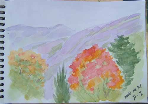 NO.582 わ〜、3枚もスケッチ、 病気だね〜♪ (08/10/31)折角の貴重な晴れ間なので、笹子地区(じねごちく)まで、ドライブ&スケッチ。 先ずは、今朝の鳥海山をご覧下さいませ〜♪(国道108号線、直売所の近くにて) 最初の画像は、笹子のドライブインからです。 って言っても、ただの休憩所(*^-゜)v。 甑山(山形県と秋田県の県境にあります)まで、行ってみたら、 甑山(左は女甑山、右が男甑山)の紅葉は、終わりでした〜(^-^;) ならば、近くの大池に寄って、スケッチを〜♪ 今日の現場は、由利本荘市鳥海町・笹子地区の大池です。 一度は描いてみたかった、木々の中の紅葉スケッチです\(☆^∇゚)o で、描き終えてから、又帰り道で描いたのが、 楓の木の紅葉が素敵なのとバックの山々が気に入って、短時間スケッチ♪ これで、お終いかと思ったら、 またまた、笹子地区の西久米集落の外れにあった、空き家を入れての紅葉スケッチ。 二人とも、もう、病気だね〜(^-^;)\(☆^∇゚)o だって、明日からず〜〜っと、雨予報。 貴重な、一日でした〜♪ 今日の絵は、大池の狙いが違ったり、 他の絵も少し違いますので、比べてもイイですよ〜\(☆^∇゚)o という事で、写真とスケッチの本日の地元情報でした〜♪ |