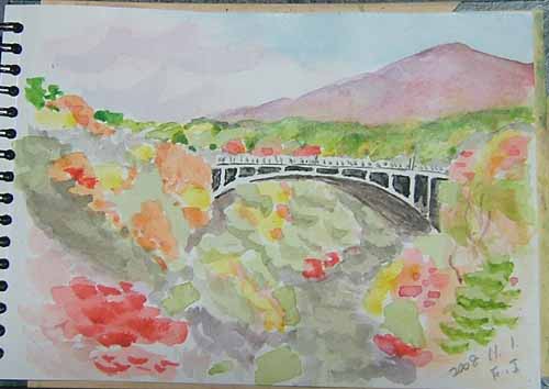 NO.583 鳴子峡の紅葉&またまたスケッチ〜♪ (08/11/1)なんと、宮城県の鳴子峡の紅葉を見に行こうと急きょ決まり、早速ドライブ。 自宅から、鳴子峡レストランハウスまで、95kmです。 先ずは、鳴子ダムに寄り道したのですが、あれれ? まだ早いみたいですね〜(^-^;) ![]() ![]() 鳴子峡の紅葉は、まだ少し早かった気がしますが、 昨年同様、景観優美な遊歩道は、今年も通行止めでした (≧m≦)。 それでもめげずに、メインの橋の入った鳴子峡をスケッチして来ました〜\(☆^∇゚)o 一段と目立った紅葉写真ですよ〜♪ 今日の絵は、主人も落ち着かづ、失敗したと言ってました〜\(☆^∇゚)o 昼食済ませてからレストハウスでお土産買ったり、鳴子のこけしを見学したり、 すぐそばで大文字草の珍しい花を売っていたので、2種類購入したり♪ ![]() ![]() ![]() ![]() やはり、ここまで来たら、温泉には入らなくっちゃね〜\(☆^∇゚)o ここは、鬼首温泉郷の吹上温泉「峯雲閣」 混浴なんですよ〜(*^-゜)v 県外とはいえ、近場で観光気分を味わって来ました(^-^;) |