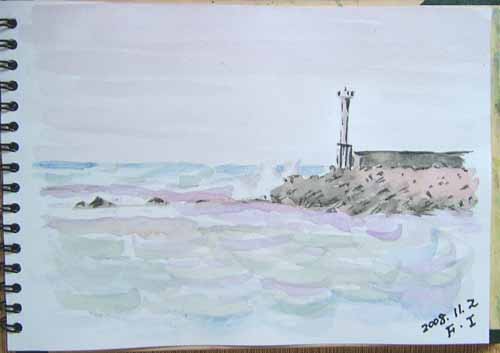 NO.584 日本海スケッチ、絶対病気だね〜(≧▽≦)ノ (08/11/2)朝9時半前、ドシャブリの雷雨の中を由利本荘市に出かけてました。 こんなにも暗いので、ライトをつけてる車が多かったんですよ〜(^-^;) (由利町の踏切にて) で、間もなく市内が近くなると、空には青空が見えています。 先ずは、画材店に行って、スケッチブックを数冊買い、 その近くの文化会館の紅葉を、走ってる車から撮影\(☆^∇゚)o それから、最初から荒れる日本海をスケッチする予定でしたので、 子吉川の河口、本荘マリーナの近くに行き、スケッチでした。 寒いので、車の中から見える景色はこんな感じです♪ 良いんです、きんぎょの目には、こういう色に見えたんですから〜♪ 主人の絵は、きんぎょの絵の左側に見える、テトラポットのある風景です。 風が強く波しぶきがあり、気に入ったそうですよ〜\(☆^∇゚)o もう、ホントに毎日まいにちスケッチばかり、絶対病気ですね〜〜(≧▽≦)ノ |