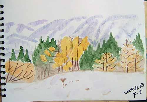 NO.597 またまたスケッチ&地元温泉♪ (08/11/23)先ずは、途中の紅葉と雪の景色をスケッチして、のんびり温泉に〜♪ ここの回数券、11枚綴りで3500円。安いでしょ?\(☆^∇゚)o 個人的に気に入ってるのは、泉質も良いのですが強力水圧のジェット・バス。 マッサージ効果抜群でたまりませ〜ん\(☆^∇゚)o 露天風呂では、にかほ市から来られた母娘さんとお喋り。 画像は、今日の雪の中の「鳥海荘」と、山側を見た景色。 ![]() ![]() あ、そうそう、今日のスケッチの現場は、由利本荘市鳥海町猿倉地区、鳥海荘から少し手前の紅葉と雪景色です。 で、本日の出来上がり〜(^-^;) 短時間スケッチ、雰囲気だけ出すのが精一杯(^-^;) きんぎょのスケッチは、右寄りですね〜\(☆^∇゚)o |