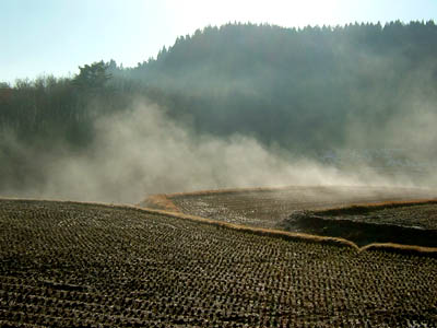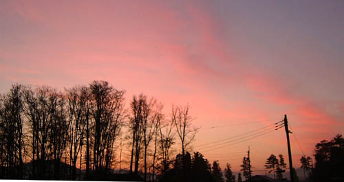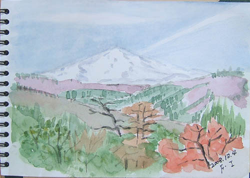 NO.600 8日ぶりのスケッチ♪(鳥海山) (08/12/4)お歳暮、年賀状の準備で忙しかったり、大掃除も始めたりで 忙しい今日この頃でした(^-^;) 朝焼けの鳥海山が、一昨日も見えましたが、今朝の鳥海山は、雲ひとつない朝焼けの景色。 嬉しくって、記念に撮りました\(☆^∇゚)o 東の空が真っ赤っか〜(ベランダから6時30分) でも、まだ南西にある鳥海山はまだ少し早い。 ハ〜〜イ、南西に見える朝焼け鳥海山です♪(ベランダから6時40分) 今朝は、霜が降りていたのね、ゴミ出しの時、西洋タンポポと周りのコケについた霜を見て感動〜♪ こんなスカイブルー、久々にスケッチに誘われて、ドライブ♪ 冷えた地面から、まるで温泉が湧き出てるような湯気を見て、記念に撮影♪(今日は暖かくなりましたね) ![]() ![]() そうそう、今日のスケッチの現場は、 由利本荘市鳥海町・外山集落から提鍋集落に至る山越え道路の途中からの大好きな鳥海山です♪ 先月降った初雪も、地面は、すっかり消えてました。 で、本日の出来上がり〜(^-^;) 丁度、飛行機雲があったので、急いでデッサン、雰囲気出せたかな?(^-^;) きんぎょのスケッチは同じ狙いでも、主人より10m位上方から、比べられないように描いてます〜\(☆^∇゚)o |