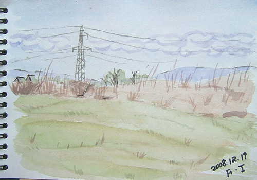 NO.605 雪もすっかり消えてのスケッチ♪ (08/12/19)25日までに年賀状うを投函すれば、元旦に配達らしいのに、昨日全部投函しちゃいました。 この先喪中のハガキが来たら、後で電話しなくちゃ〜〜(^-^;) 大掃除も徐々に遣りつつ、何かと忙しい毎日の中、何とスケッチに誘われてドライブ&スケッチ♪ 今日のスケッチの現場は、由利本荘市鳥海町・上原の風景です。 積もった雪もすっかり融けてしまい、雪のない草原を記念スケッチ。 高圧線とススキと原っぱの草原風景ですが、雰囲気出たかしら?(^-^;) で、本日の出来上がり〜♪ 雲が面白かったのに、だんだん消えて来たけど無視〜(^-^;) やはり狙いは同じですが、微妙に違いますね〜\(☆^∇゚)o そうそう、昨日18日は朝焼けが見えたのに、すぐ曇り空から雨の一日でした。 17日は、一日中快晴のお天気。 有意義に暮らした一日♪ 記念に、鳥海山も撮って来たりしてました (亀ヶ森から撮影) 16日も、こんなに奇麗に顔出した鳥海山♪(才ノ神から撮影、ここは、雪がまだ残ってましたよ♪) 地元温泉の帰りに撮っちゃいました〜(^-^;) スミマセン、鳥海山見ると、すぐシャッターを押してしまいます〜\(☆^∇゚)o |