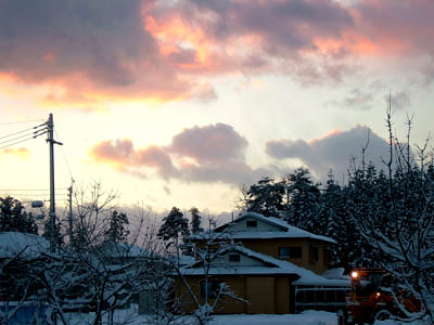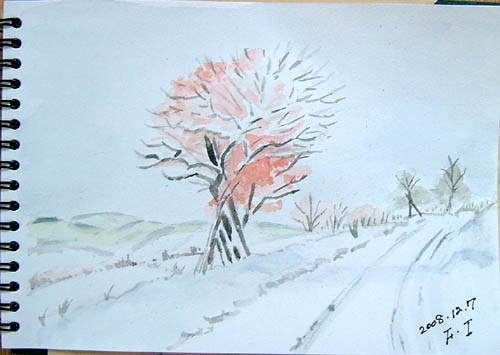 NO.602 12月降雪記念スケッチ♪ (08/12/7)で、今朝起きると、30〜35センチ位は積雪になってましたので、最初はママダンプで雪寄せ。 でも、除雪機の試運転のチャンスなので、我が家の除雪機「雪太郎」のお出ましです〜♪ 「ハ〜〜イ、快調に動いてます〜♪」「あ、市の除雪車も来ました〜♪」 ![]() ![]() すっかり、綺麗になったとたん、東の空には朝焼けが出てましたが、あっという間に消えましたよ〜(^-^;)(AM 6:50) ![]() ![]() 朝食後早速、里の風景でも描こうとスケッチに誘われ、あちこちドライブ。 道路を走っていて目についた一本の立木が印象的なのでスケッチすることに決定 今日のスケッチの現場は、由利本荘市鳥海町上田野の風景です。 この道下ると、地元小学校の傍を通ります。 で、本日の出来上がり〜♪ 何にもないので、簡単でした。雰囲気出たかしら?(^-^;) 車中なので同じ狙いです、比べないでね〜〜\(☆^∇゚)o スケッチ現場の左下には、こんな雪の花が咲いていましたよ〜(^-^;) |