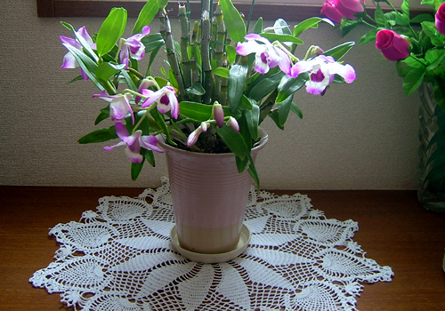 NO.623 立春・デンドロビュームが咲いたよ♪ (09/2/4)一昨日、デンドロビュームの花が2個咲いたので記念に撮りました。 年々花数が少なくなるのは、お手入れが悪いからでしょうね〜(^-^;) 2月2日は2個だけ咲いて・・・ 立春の今日は、あっという間に、こんなに開いたので記念撮影(^-^;) (^^;☆\(▼▼#) デンドロビュームは、ランの中では寒さに強く育てやすい洋ランなのですが、 花を咲かせるのが難しいランということですね。 |
