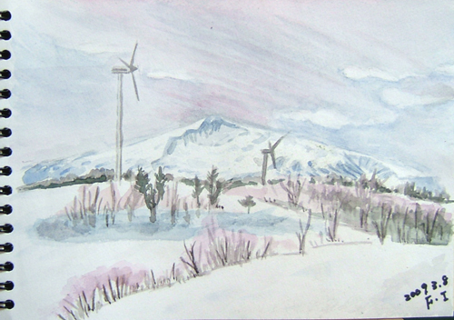 NO.633 仁賀保高原から鳥海山スケッチ♪ (09/3/8)いつも、我が鳥海町の鳥海山ばかりなので、今日は反対側から見える仁賀保高原までドライブ♪ 途中にある、矢島町の花立て公園に立ち寄りお馴染みの怪獣さんを撮ったり、 全国第2位の天体観察良好の土地という塔を撮ったり。 三日月のオブジェが可愛いでしょ?\(☆^∇゚)o ![]() ![]() ![]() 仁賀保高原には、「土田牧場」があり、 ここの乳製品は何でも凄く美味しいですよね〜♪ まだ誰もお客さん居なかったですが、 ソフトクリームを食べてから、 スケッチの場所探しに〜(^-^;) 今日の現場は、にかほ市仁賀保高原からの鳥海山。 なんと、いつの間にか薄曇り空になってしまいました(^-^;) で、今日の出来上がり〜♪ 薄雲りになっても鳥海山は風車と共によく眺めることができましたよ〜(*^-゜)⌒☆ |