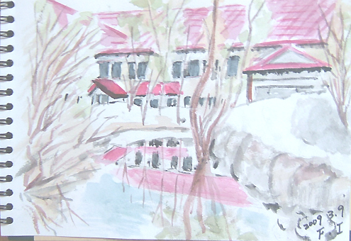 NO.634 スケッチ&稲住温泉♪ (09/3/9)久々に稲住温泉(秋の宮温泉卿)までドライブ&にスケッチに〜♪ 地元直売所の近くから眺めた今朝の鳥海山です(AM:8時50分) 今日は、4月の陽気とかで、とっても暖かかったですね〜♪ 温泉に入る前に、急いで描いたスケッチ、雑な仕上がりに、 本当は恥ずかしくて公開出来ないのですが、記念ですから〜(^-^;) 今日の現場は、県南にある 稲住温泉(秋の宮温泉卿)の駐車場傍の 小さな造池を入れて旅館の一部を描きました。 水面に映った残雪や旅館を描きたかったですが、 早く温泉に入りたいと思うと雑になりますね〜(^^;☆\(▼▼#) で、今日の出来上がり〜(^-^;) 今回狙いは違うので、比べられませんよ〜\(☆^∇゚)o 男性の方は、誰も居なかったそうですが、不景気ね〜(^-^;) でも、女性の方は、露天風呂に一人(埼玉)と内湯に3人(山形の女友達3人組) やはり、女性は温泉好きなのね〜♪ 写真は湯上り後、両方とも誰も居ないとき撮りましたよ。 やや熱めでしたが、気持ち良かった〜♪ そうそう、ここの温泉は、卓球の愛ちゃんとご親戚なんですよ〜♪ |