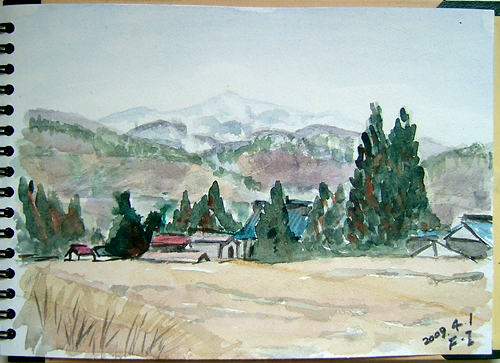 NO.645 8日ぶりのスケッチ♪ (09/4/1)今日の現場は、由利本荘市鳥海町・興屋集落から国道108号線に下る手前の景色。 笹子方面の山並みが残雪で素敵ですよ。 今月最初のスケッチ、杉の木の花粉がタップリついてて、 見てるだけでもクシャミが出そうですね〜。 花粉症の方は、見ない方がイイかも〜(^▽^;) で、今日の出来上がり〜(^-^;) 今回も同じ場所、同じ狙いでしたが、前回よりイイかも〜\(☆^∇゚)o (^^;☆\(▼▼#) |