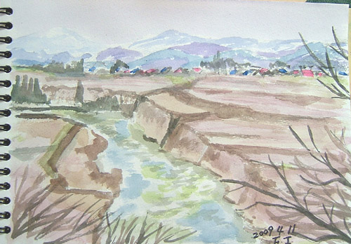 NO.651 5日ぶりのスケッチ♪ (09/4/11)田園風景は、残雪も無くなって、美しいとは云えない景色なんですよね〜 でも、春霞のかかった山並みが気に入ったので描きましたよ\(☆^∇゚)o 今日の現場は、由利本荘市鳥海町・八木山集落から笹子川を入れた 平根集落の田園風景です。 で、今日の出来上がり〜(^-^;) 今回は、狙いが違います。 気楽ですね〜♪ (^^;☆\(▼▼#) |