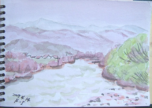 NO.654 またまた、スケッチ(^-^;) (09/4/14)曇り空で春霞で霞んだ山並みと子吉川の風景はロマンチックかも〜\(☆^∇゚)o 今日の現場は、由利本荘市矢島町・坂之下橋からの風景です。 雪解けでの水量が増している子吉川は、いかにも春の子吉川ですね〜(^-^;) で、今日の出来上がり〜(^-^;) 今回は狙いが同じ。 短時間のせいか、きんぎょは、漫画チックかな〜 気分は春ですから〜♪ |
