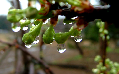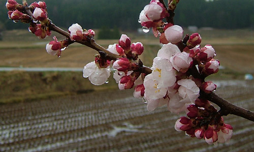 NO.655 久々の雨に「恋のしずく」が〜♪ (09/4/16)一昨日の夜から、降り続いた雨。 すっかり乾燥してしまった庭も、何だかとっても嬉しそう〜♪ 今朝、雨が止んだ庭で、ソルダム(スモモ)の蕾についた水滴 「恋のしずく」に、思わずシャッターを〜〜\(☆^∇゚)o なんとなく、ふた粒づづ並んだ「恋のしずく」に見えませんか? (*^m^*) 〜♪ 春の陽気で、雨粒もカップルに・・・(^^;☆\(▼▼#) 我が家から嫁入りした、杏の花です。、隣の庭で咲き始めましたよ〜♪ こちらのライブカメラの右端にも、観辛いですが写ってますよ〜^-^;) こちらで で、お聴き頂けますよ♪ |